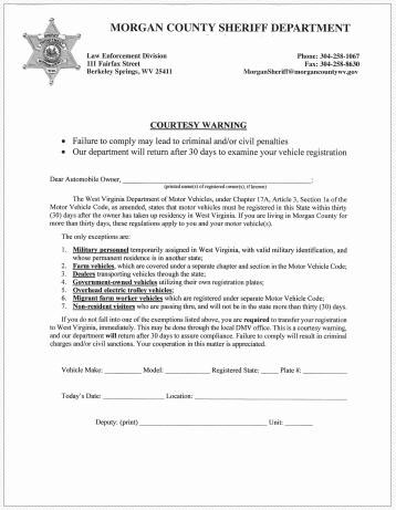 Sheriff's Courtesy Warning “Soon we will begin efforts to seek compliance on those folks If have have information about someone living in the state of WV with out of state tags |